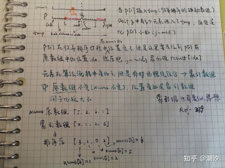 但是本题有所不同:归并阶段统计信息时要追溯元素在原始数组中的位置。正常的归并排序过程中,元素的位置已经被打乱,此时要追溯元素在原数组的位置,需要引入索引数组的思想。